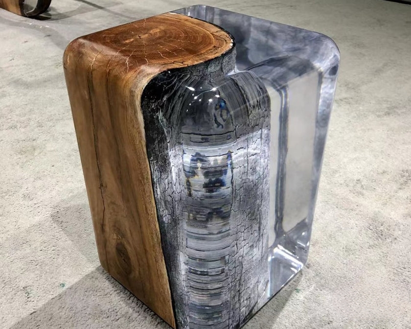 Le bois a préalablement été brûlé afin de figer ses craquelures.